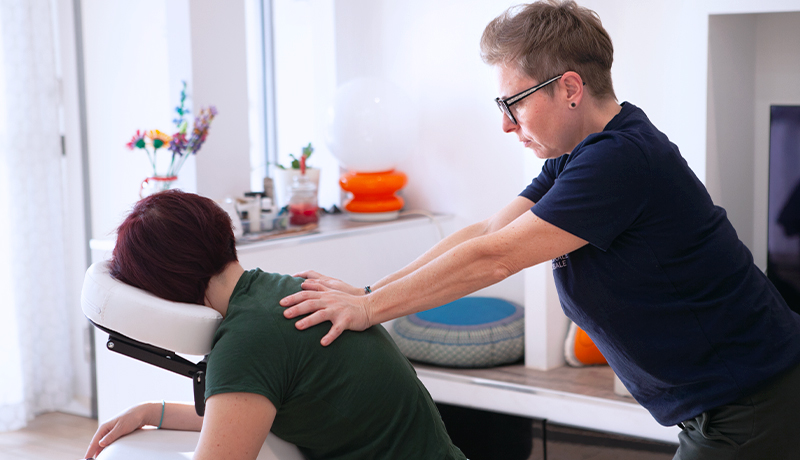 Il Business Massage su sedia ergonomica è un trattamento completamente manuale che va a lavorare su schiena, trapezi, collo, spalle, braccia, avambracci e mani tramite impastamenti, frizioni, digitopressioni, pressioni, rotazioni, mobilizzazioni e allungamenti.